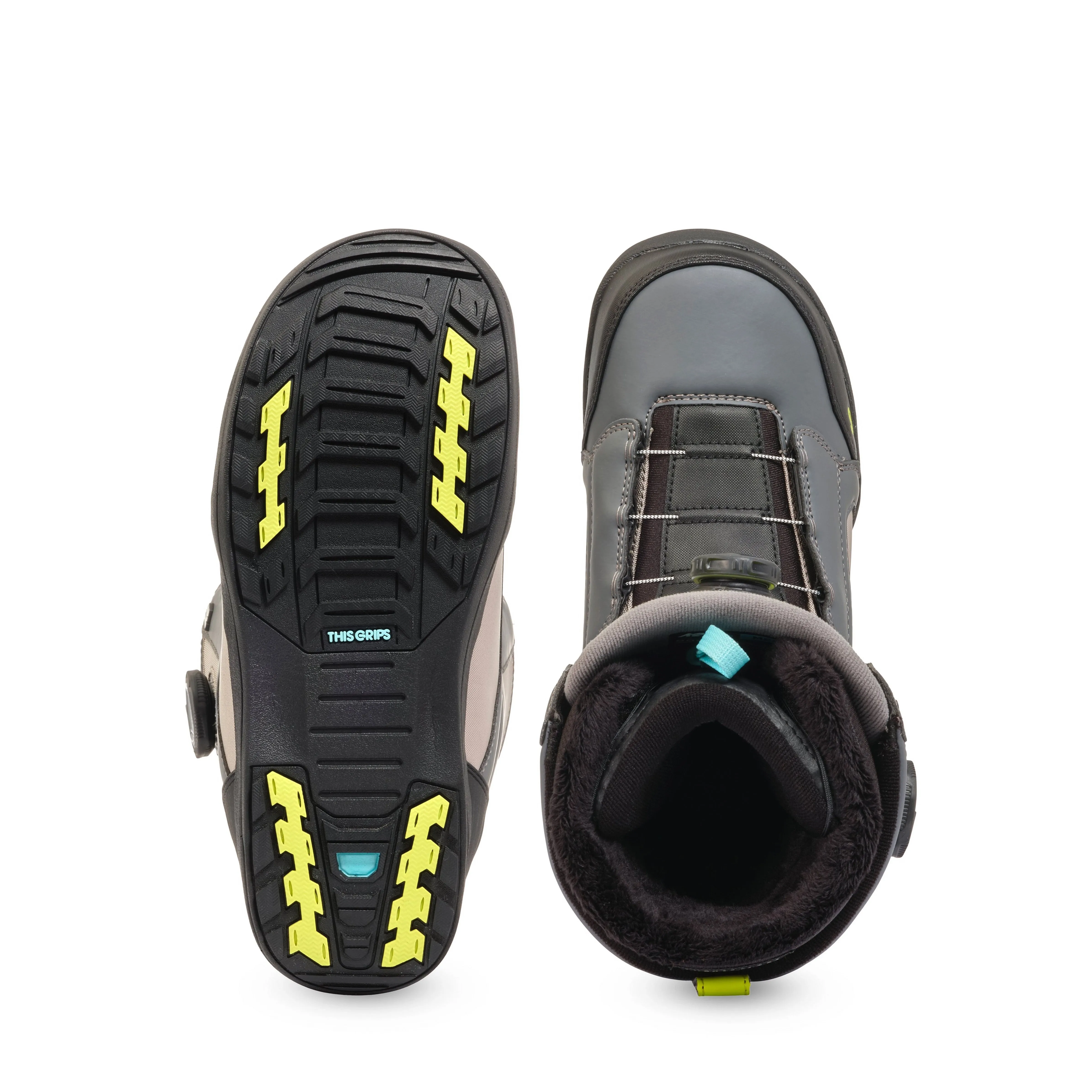 Underfoot, our proprietary This Grips!™ rubber outsole provides excellent grip while hiking, boot packing, and walking across icy parking lots and sits atop a dual-density midsole. This midsole features a lightweight EVA material and is complemented with our Harshmellow™ damping material to cushion your bones and reduce fatigue after long days on the hill.