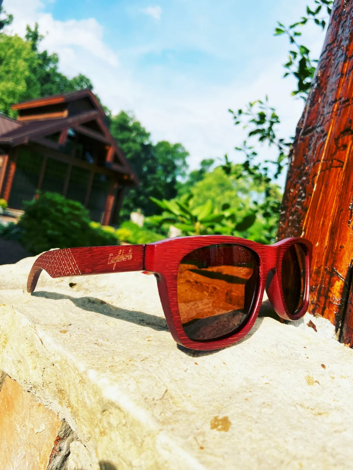 Engleberts Premium Crimson Wooden Sunglasses, Tea Colored Polarized Lenses, HandCrafted, UV 400 Protection, Anti-Reflective Cat 3 Lenses, Artisan Engraved, Eco-Friendly.