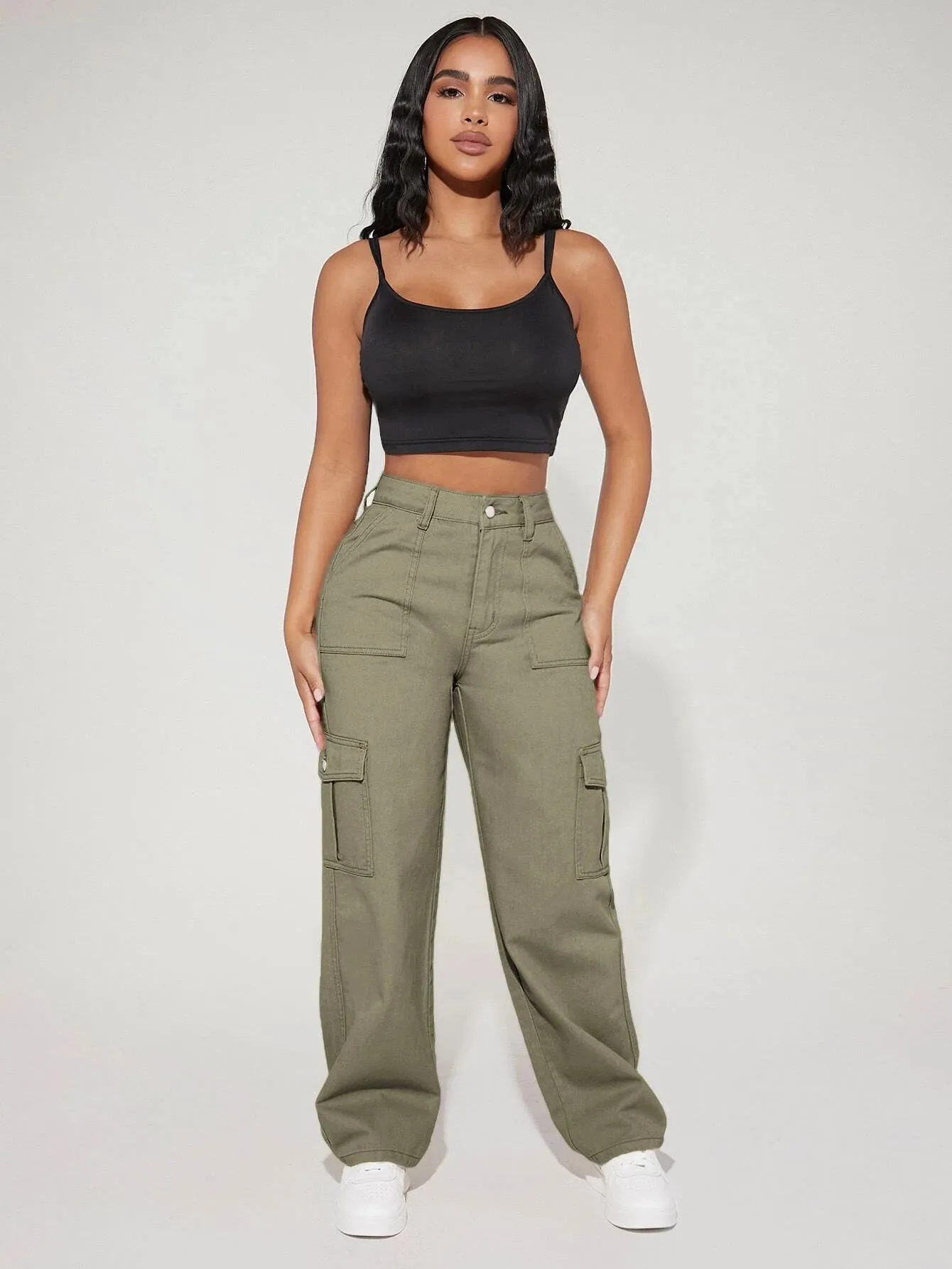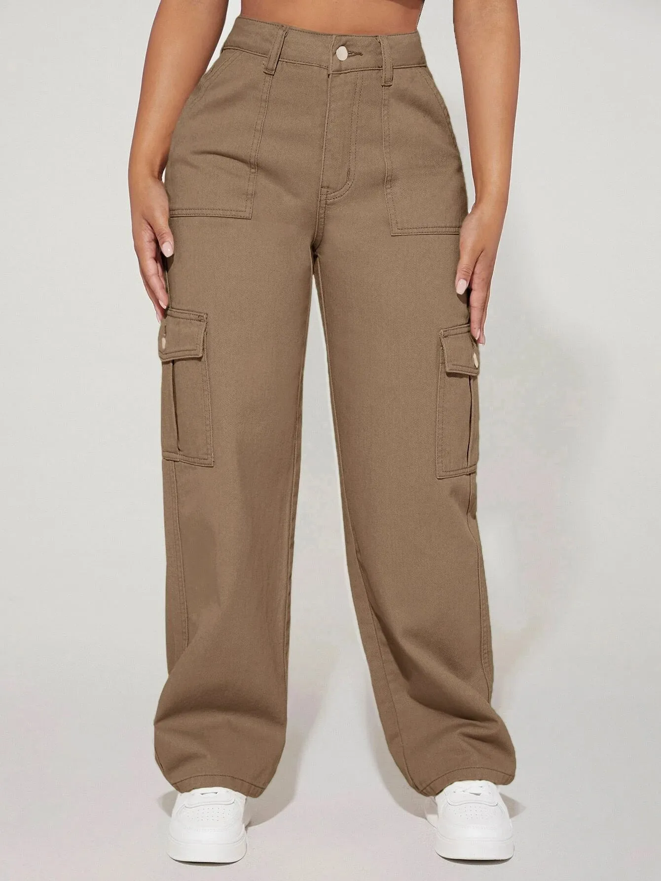 Introducing the epitome of modern utility and effortless style - the High Waist Flap Pocket Cotton Cargo Jeans. This iconic piece merges practicality with a touch of sophistication, designed to elevate your fashion game to new heights. Crafted from premium cotton fabric, these jeans boast a high waist silhouette that accentuates your curves while providing a comfortable fit.