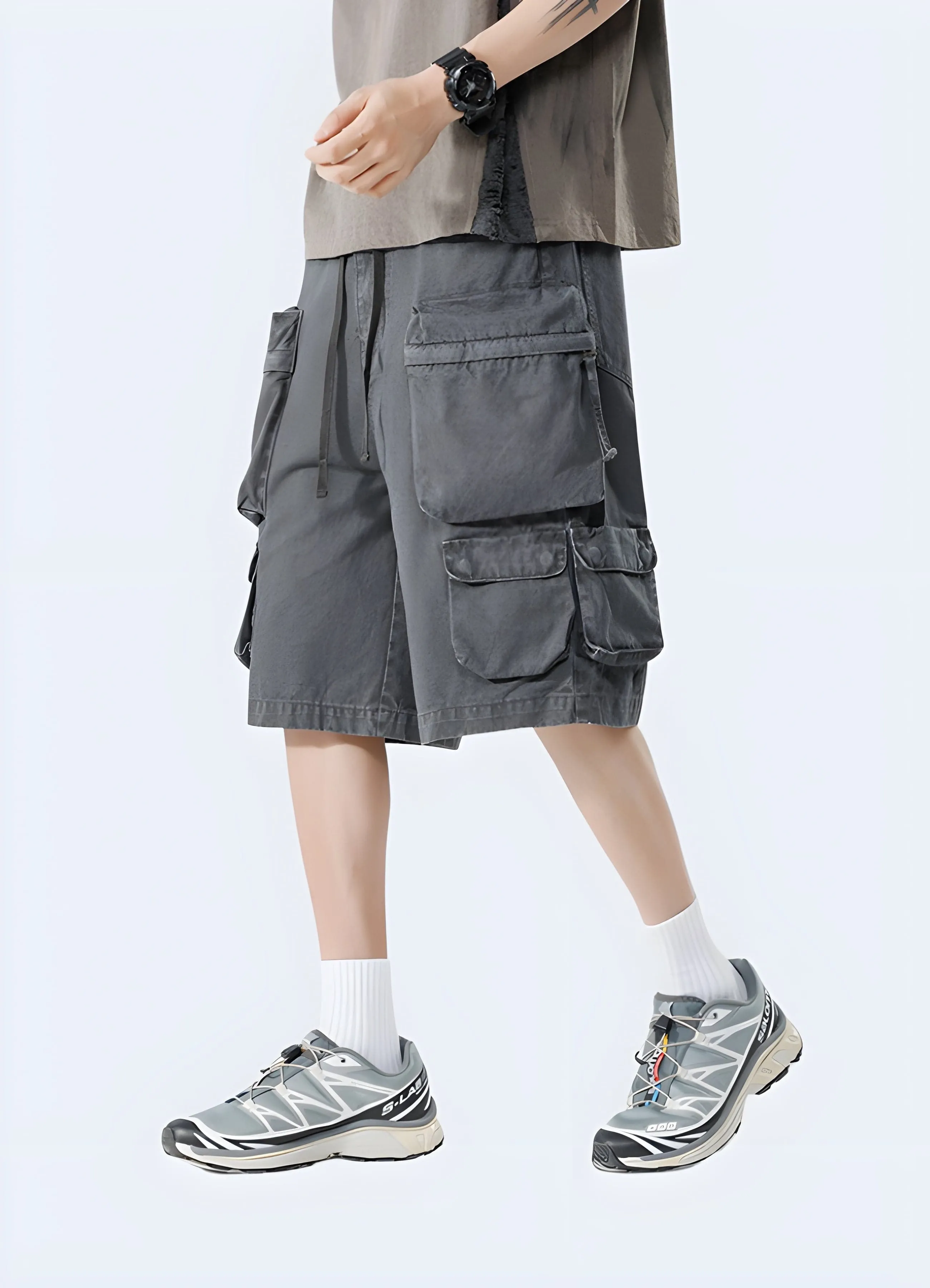 The Industrial Cargo Shorts feature a plethora of pockets strategically placed for maximum functionality. Each pocket is secured with a robust zip closure, eliminating the risk of losing your valuables during your urban explorations. Additionally, a convenient drawstring attached to each zip closure allows for further customization and a secure fit.