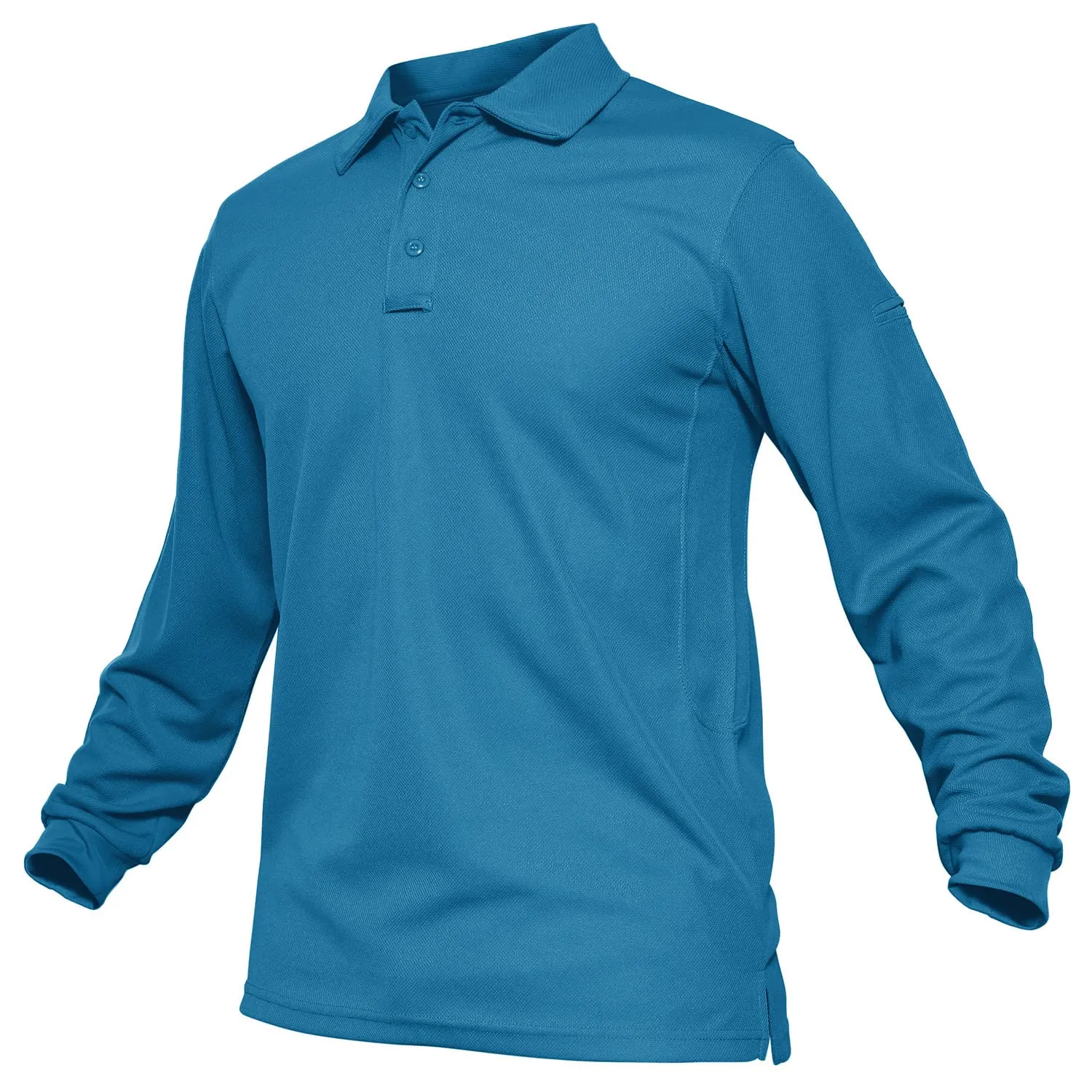 - Design: Classic stand-up collar long polo shirt with underarm stitching and triple bottom front closure; sunglasses/microphone loop under buttons; double pen pockets