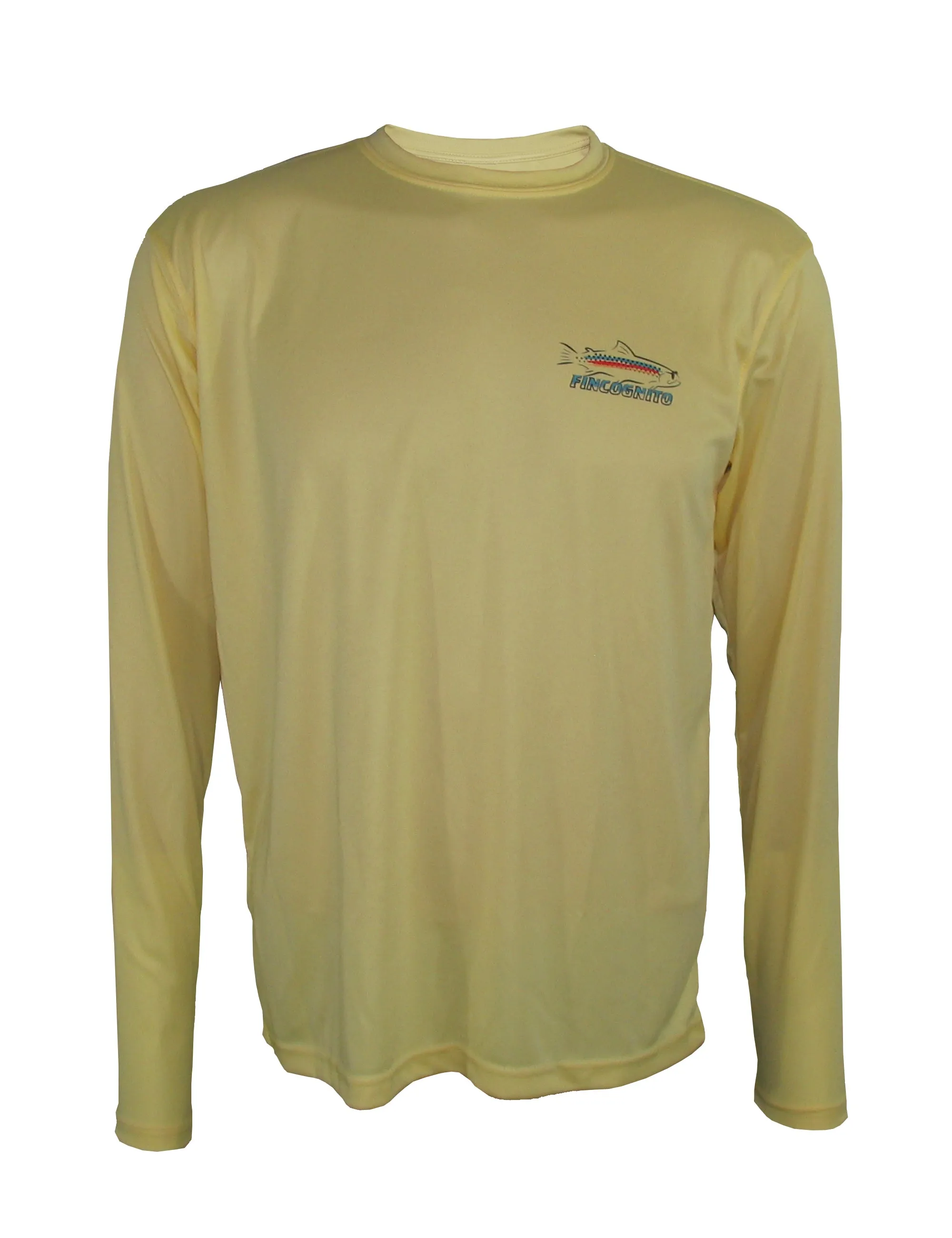 Lightweight sun protective SPF 50 fishing shirts. We place Ed Anderson's "Colored Brown" on the back of this pale yellow-colored long sleeve T-shirt. The Fincognito logo adorns the left chest. 100% polyester with PURE-Tech wicking technology. Our fly fishing apparel works well on the water or as hiking clothes on the trail. Great sun protection, moisture wicking apparel.