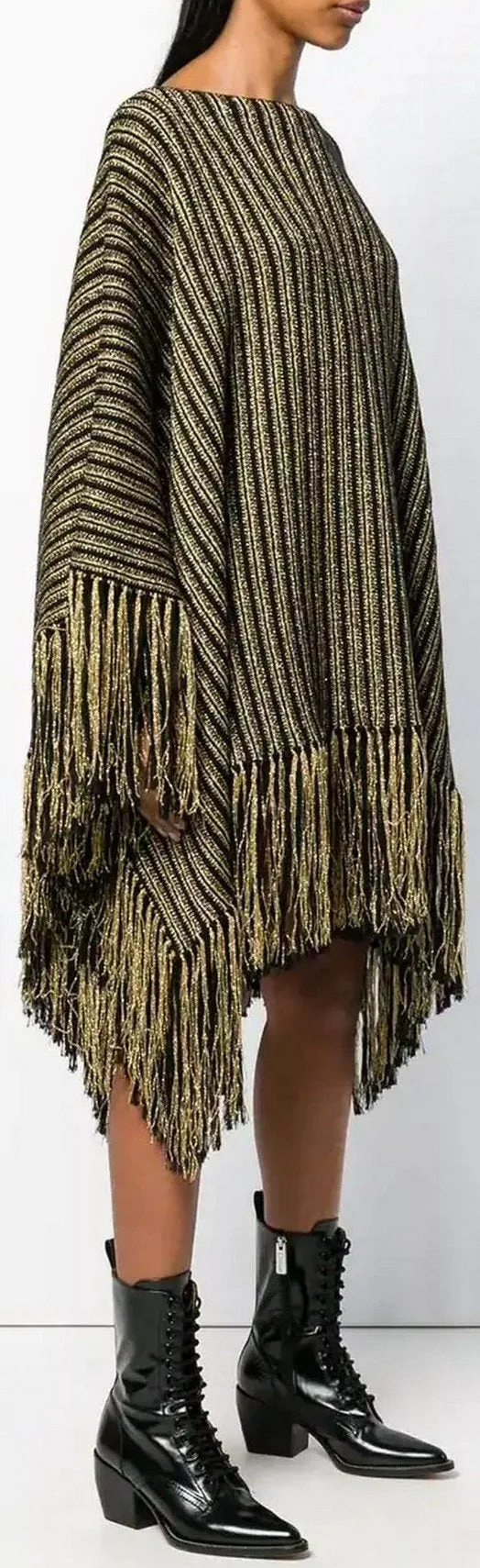 Metallic Striped Oversized Poncho with Fringed Hem and Matching Scarf