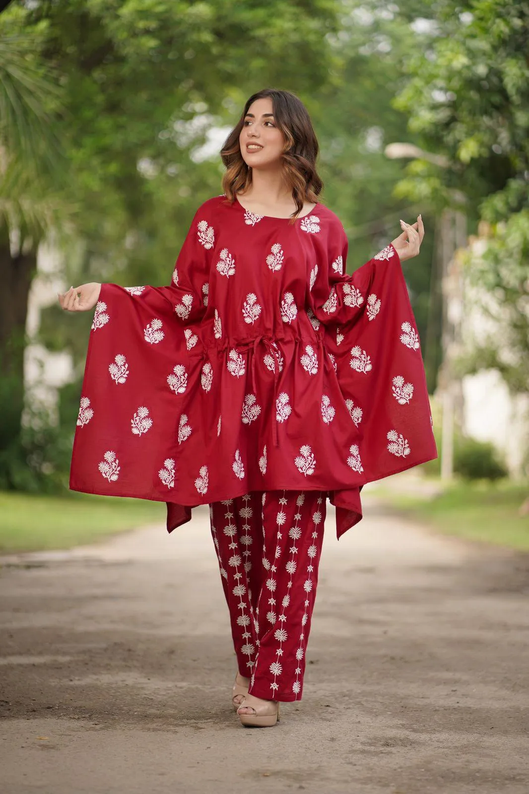 Beautiful Red and Black embroidered Ponchos with all over Embroidered Trousers.