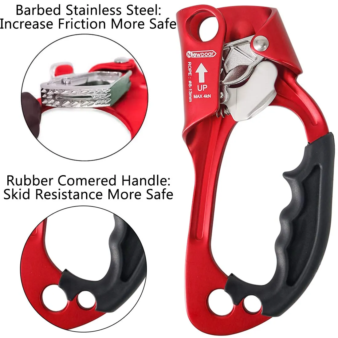- [Powerful and Durable]: Comfortable Grip rubber handle adds the friction and protects climber's hand. Solid Stainless Steel Cam made of stainless steel, rustproof and anticorrosion, can handle most situation and service for long.Multiple Holes For connecting carabiners and webbings. 2 hole attachments in both upper and lower side of ascender,The upper hole is usually used for carabiner, and the lower hole is usually used to attach the foot ring.