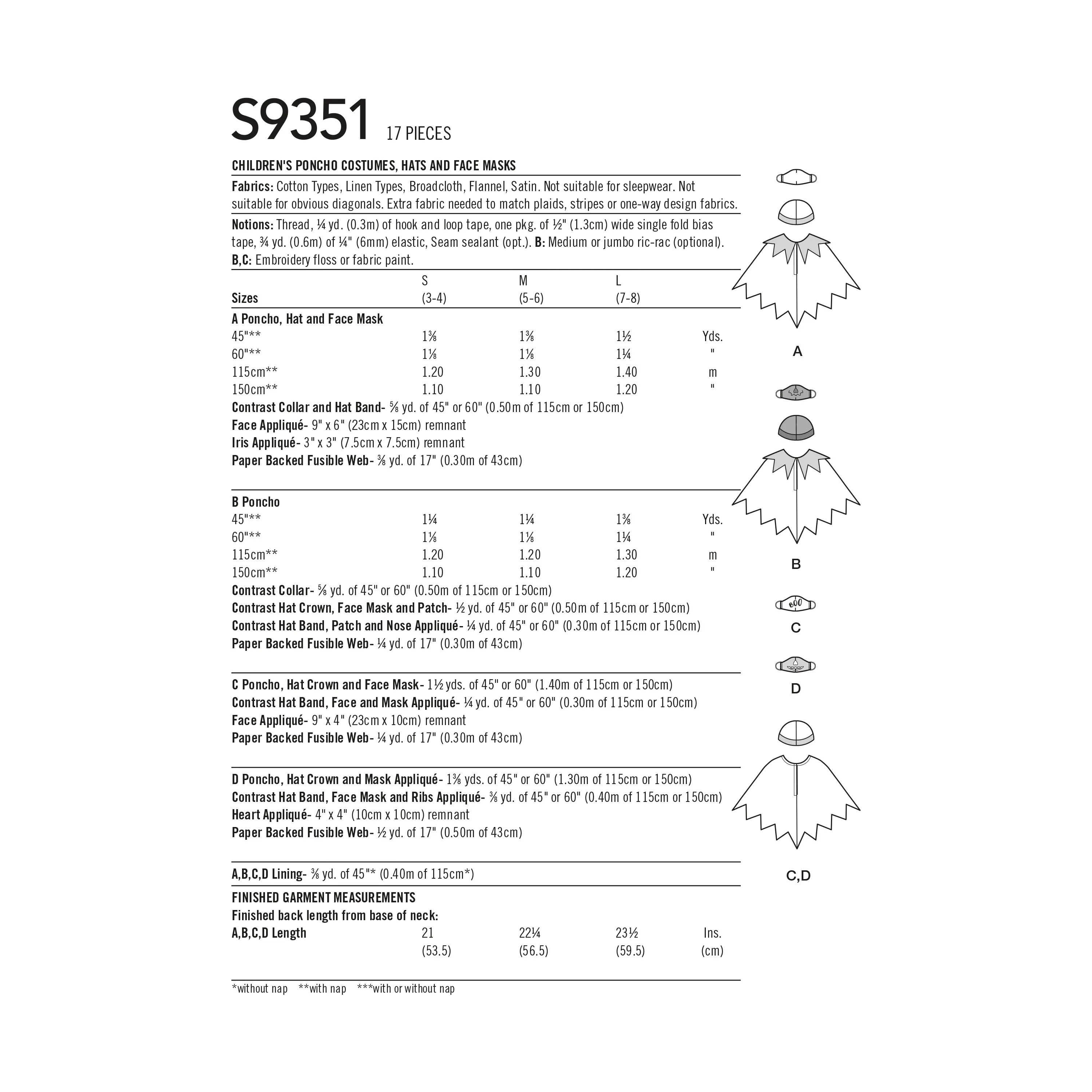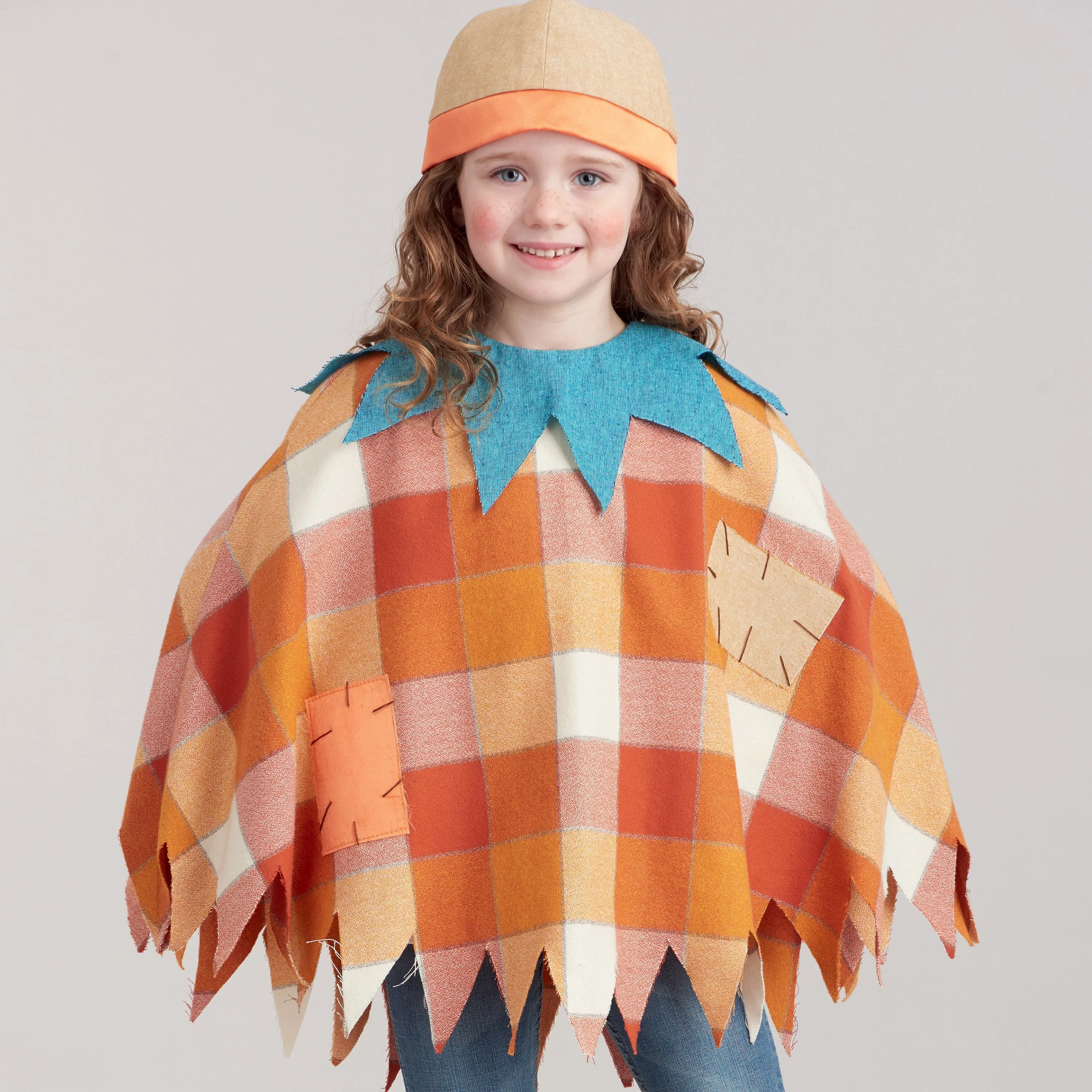 Simplicity Sewing Pattern for Easy pullover ponchos for kids have back hook and loop closure, jagged no-finish hems and appliques to create Pumpkin, Scarecrow, Ghost and Skeleton characters. Pumpkin and Scarecrow have jagged no-finish collars. All ponchos include matching hats to fit 19", 20" and 21" head sizes and face masks.