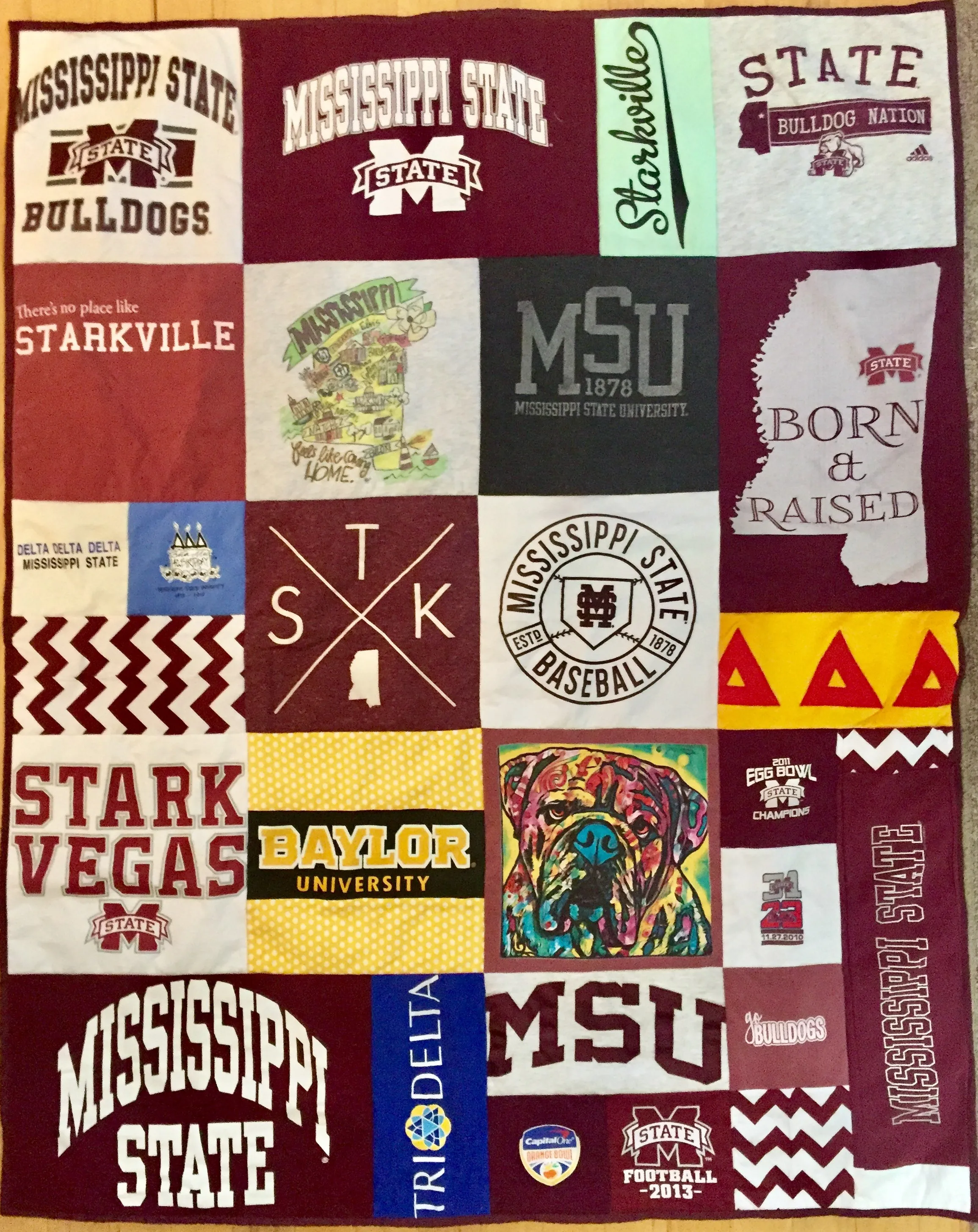Our best-selling t-shirt quilt is about the size of a couch throw and measures 48x60 inches and made from 20 different t-shirts.