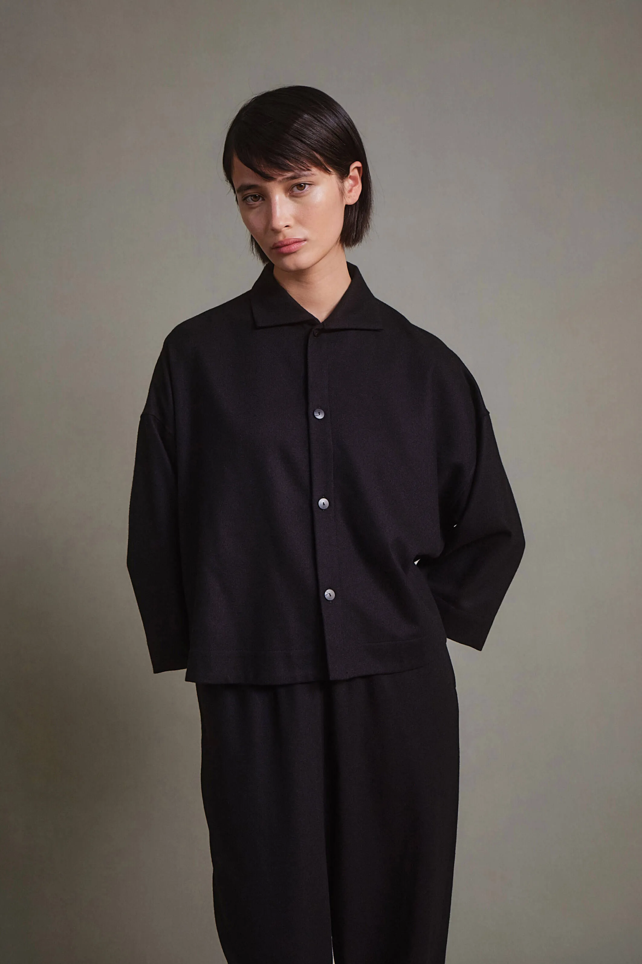 This shirt is made in wool-cashmere flannel, one of Toogood's bestselling fabrics. The blend of virgin wool and cashmere is woven especially for Toogood in Italy. This rich, soft fabric has a luxurious drape, elevating Toogood's iconic silhouettes. The Camper is a boxy cropped shirt with a soft folded camp collar and 3/4 length sleeves.