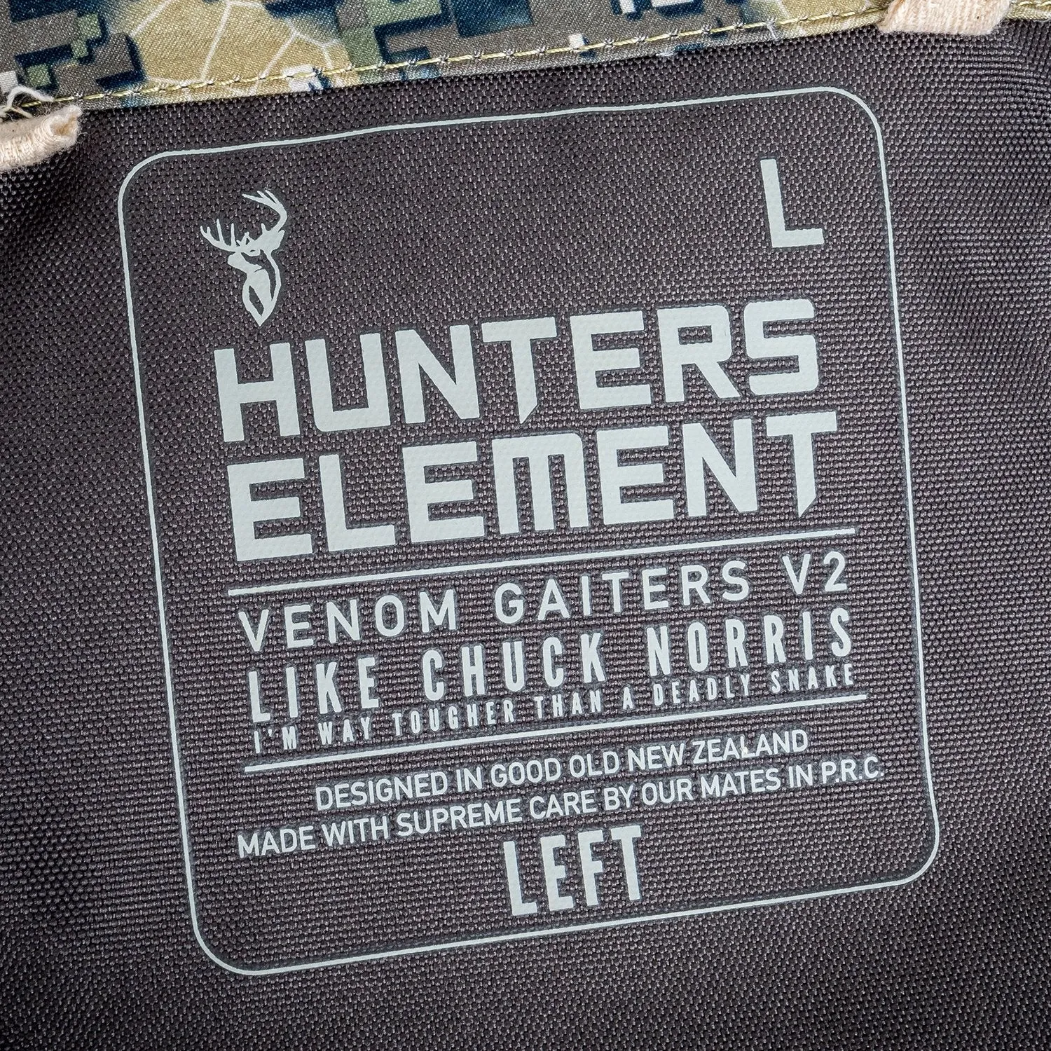 Hunters Element Venom Gaiters were designed and tested for resisting bites from Australian snake species. These gaiters should not be treated as snake proof. Hunters Element, Evolve Outdoors Group Ltd and Peter Bryant do not guarantee the safety of the user from snake bites. Although sample tests resulted in 0% fang penetration from a variety of snake species, there is no guarantee that the wearer will not be bitten. Venom Gaiters should be used as a safety precaution only and in conjunction with other precautions.