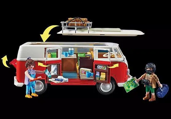 The playset contains two PLAYMOBIL figures, a Volkswagen T1 Camping Bus with removable roof and suitcases, detailed interior with folding dining table, foldable back seat, side doors with mirror and space for food and many other loving extras.